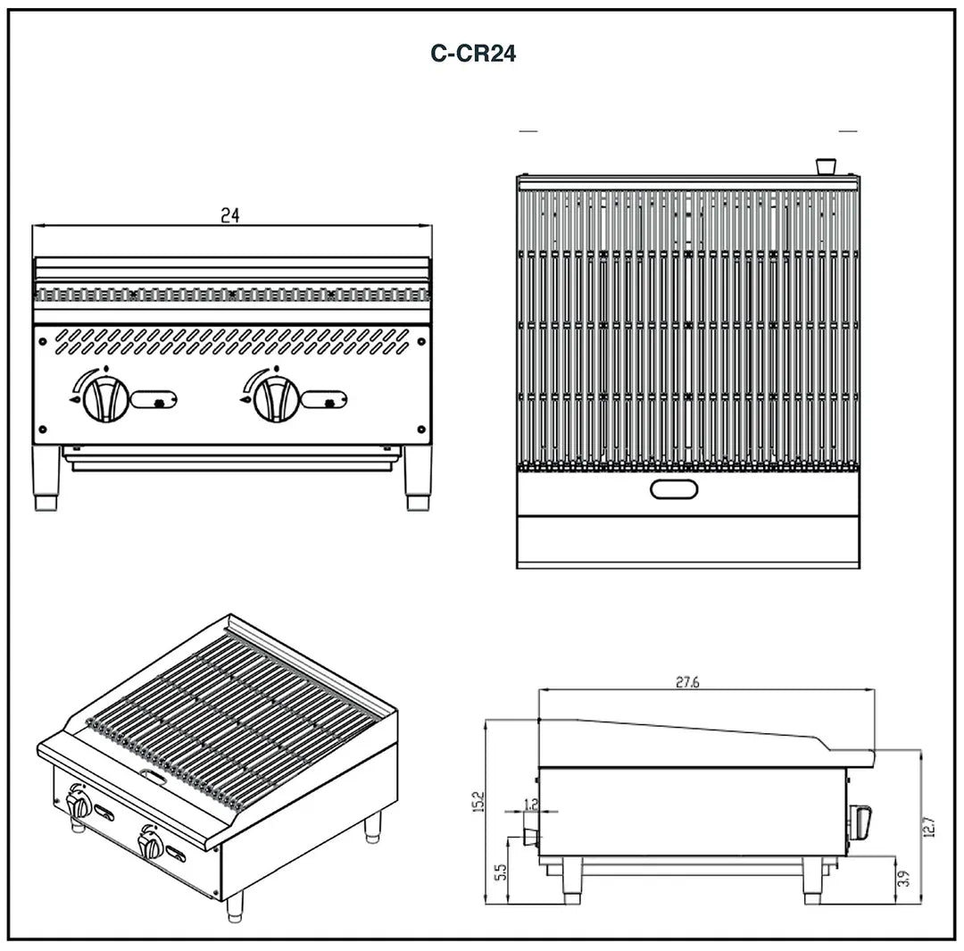The Migali C-CR24 is a durable, high-performance commercial countertop gas charbroiler designed for restaurants, steakhouses, and food trucks. Featuring dual U-shaped burners and lava rock technology, it delivers authentic flame-grilled flavor with even heat distribution across a heavy-duty cast-iron grate surface.